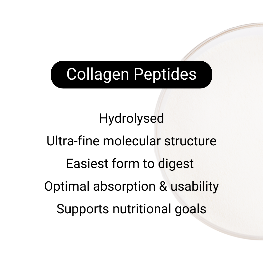 In comparison, COLLAGEN PEPTIDES (or hydrolysed collagen supplements) are ‘Hydrolyzed’, meaning the amino-acid chain structures have been shortened again using a natural enzyme hydrolysis (water) process that makes the amino acids even more bioavailable. Although gelatin & collagen peptides may contain some of the same amino acids, the amino acids in Collagen Peptides are more easily absorbed & used than that in gelatin.