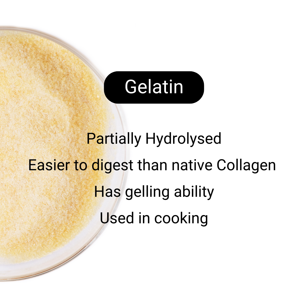 GELATINis created when the cow hides are dissolved in water, breaking down the native form of collagen & resulting in a jelly-like stock when cooled. This process is known as ‘Partial Hydrolysis’ and makes the native form of collagen easier to digest by making the amino-acid chain structures shorter. This method of breaking down the collagen from hides has been used for centuries by many traditional cultures throughout the world. Gelatin is mostly used for culinary applications due to its ability to gel, whereas collagen peptides do not have this gelling ability.