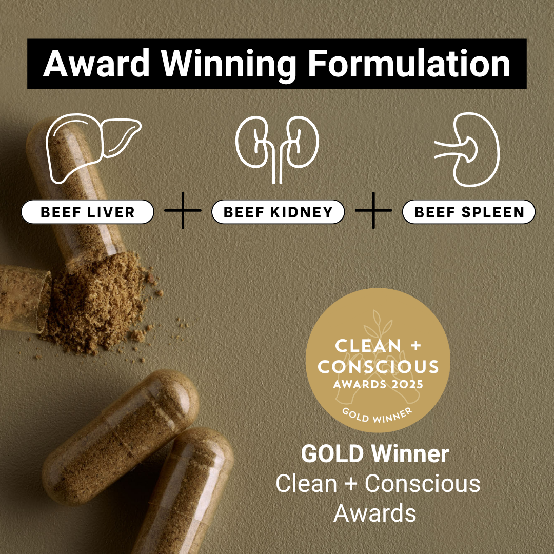 Freeze-dried beef liver, kidney, & spleen wholefood capsules with the MOST METICULOUSLY TESTED & VERIFIED nutritional profile on the market.