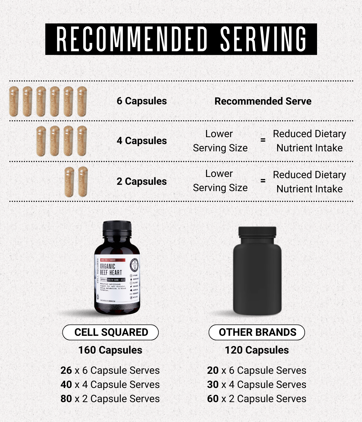 1 Serve (6 capsules) = Up to 16g raw beef heart or up to 32g cooked beef heart.