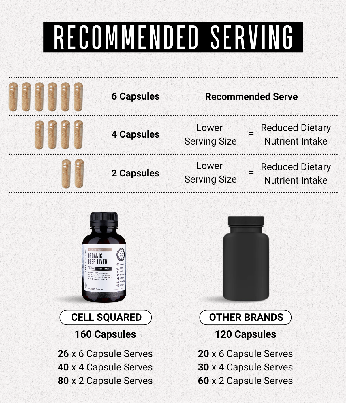 6 capsules = Up to 18g raw beef liveror up to 34g cooked beef liver.
