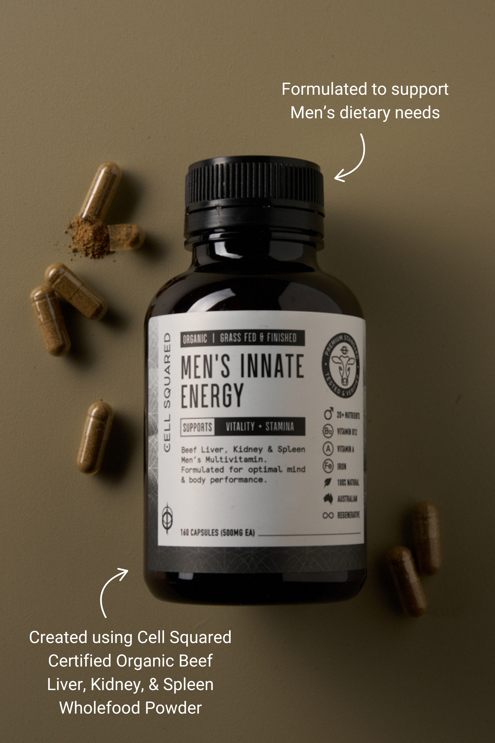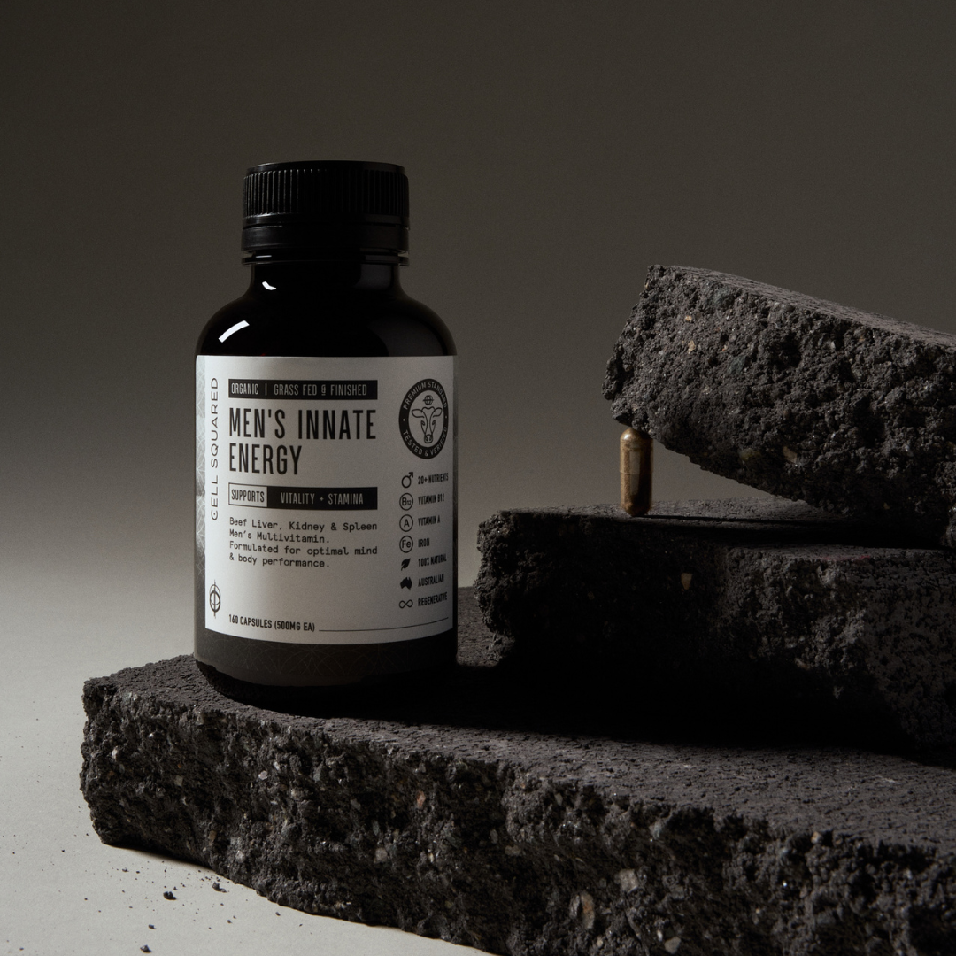 Searching for a natural beef organ multi for men? Discover Men's Innate Energy Beef Organ Capsules, consciously created using our unique blend of Australian Certified Organic Beef Liver, Kidney, & Spleen wholefood powders. Encapsulated for those sensitive to taste & smell of beef organs. Providing essential naturally occurring nutrients, formulated to support men's overall diet & nutrition. Each bottle contains 160 capsules.