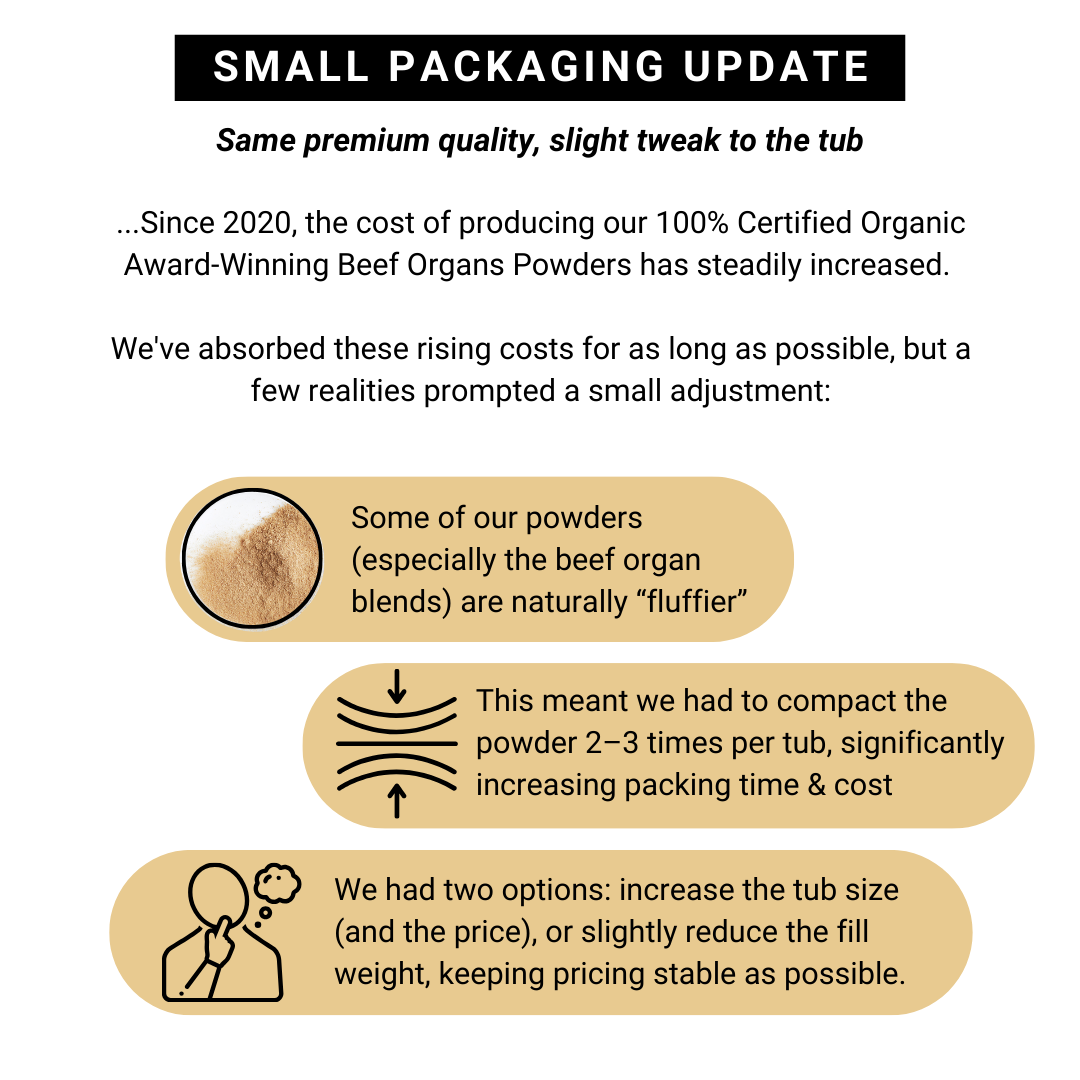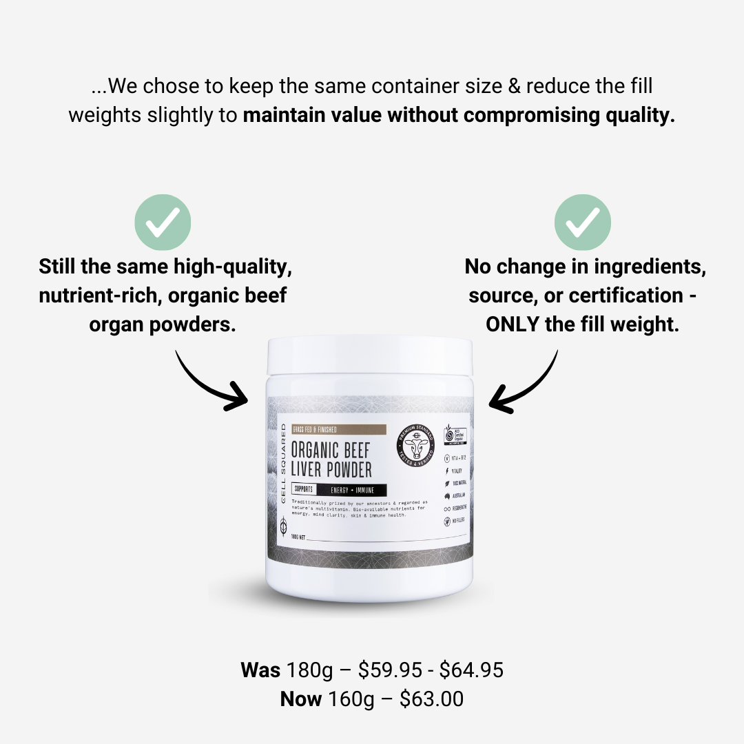 • For our more convenient & tasteless option, please see our Organic Grass-Fed Beef Capsule range - created using the exact same wholefood beef liver & beef organ powders.