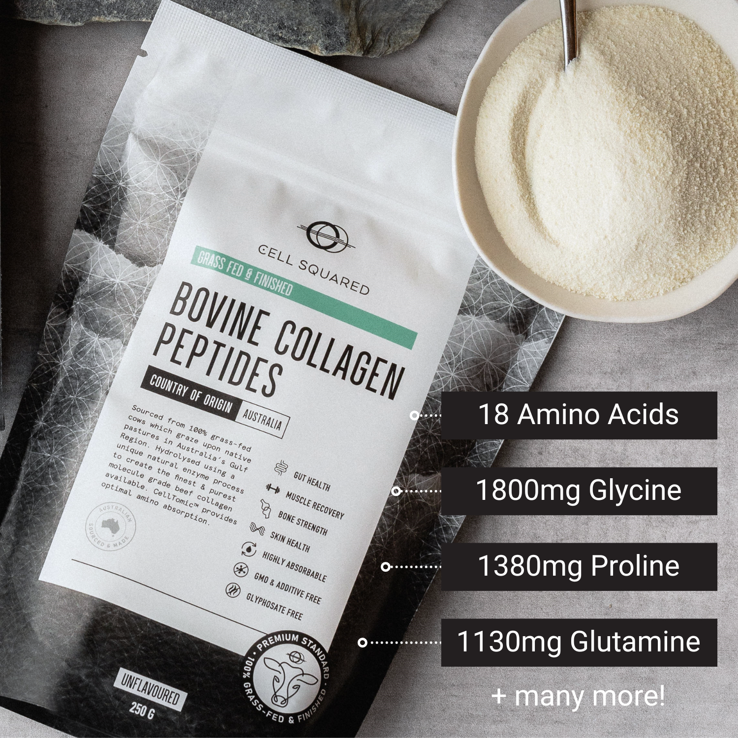 Our Hydrolysed Bovine Beef Collagen Peptides are 100% Australian made from certified pasture-fed cattle (no grains ever), guaranteeing a strict set of audited standards are always met.