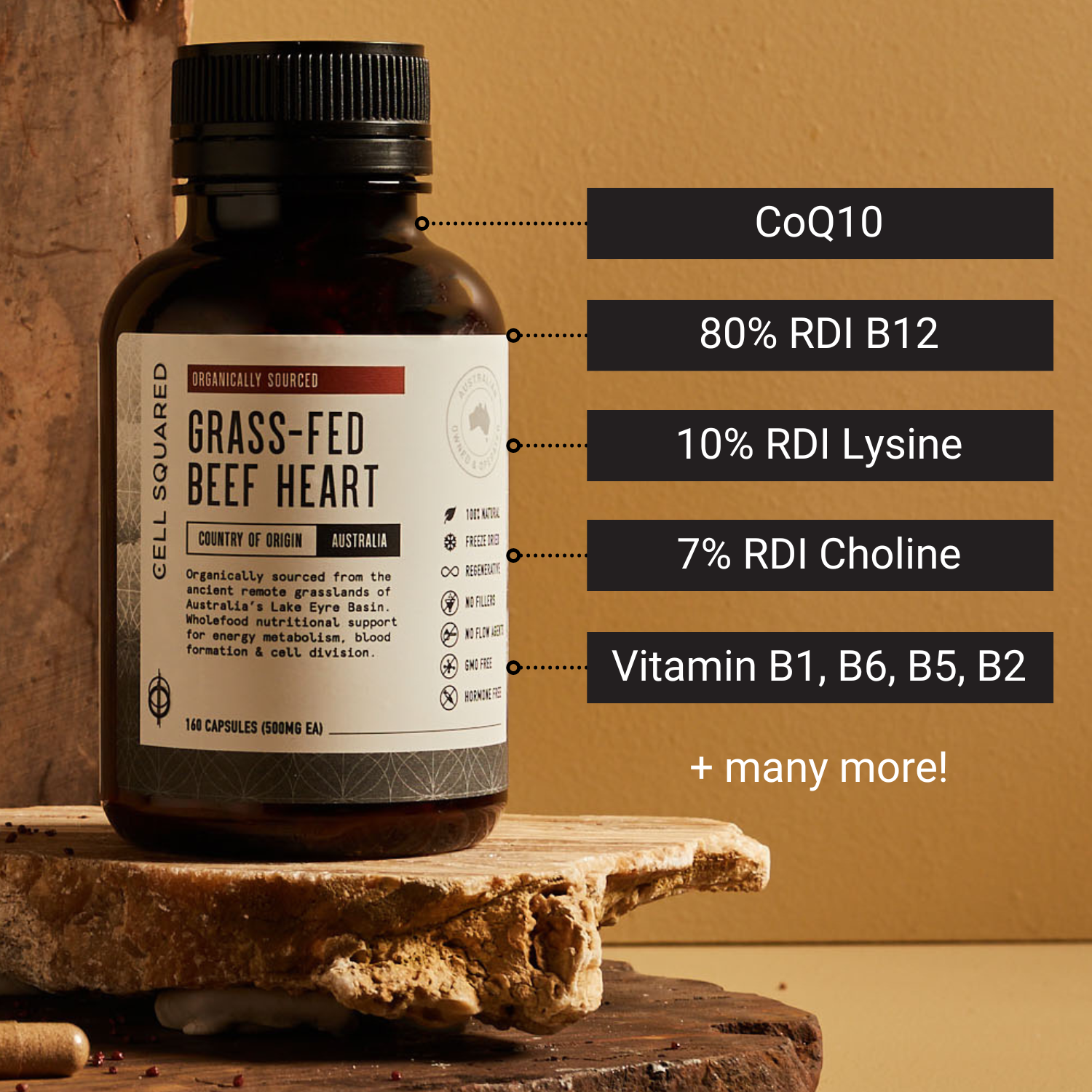 This unique blend of grass-fed & finished beef organs is among the most nutrient dense you can find, a rich source of Vitamin B12, Vitamin A, Copper, Riboflavin, Folate, Selenium, Heme Iron, B vitamins, plus many more, minerals & aminos.