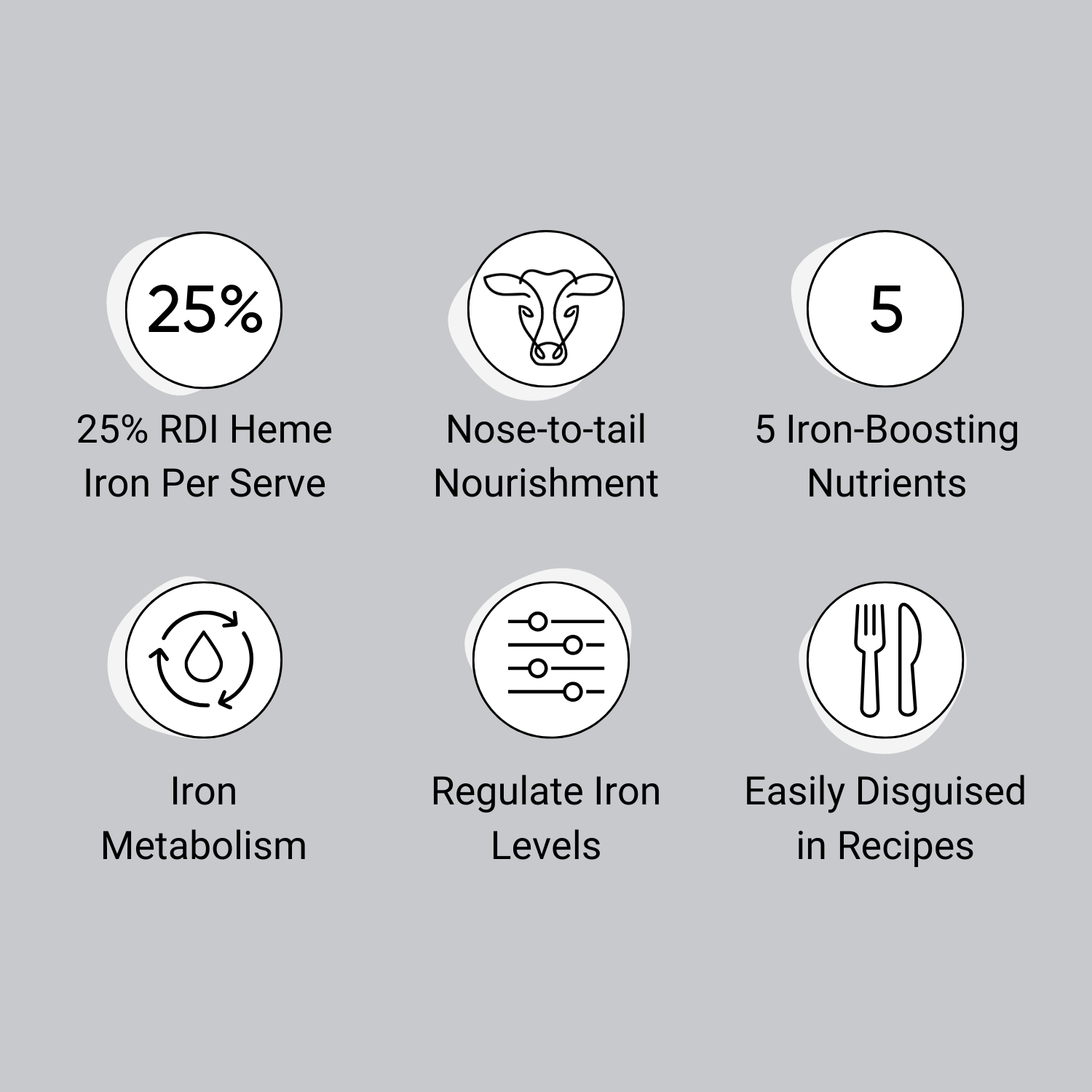 For targeted Iron support with 'nose-to-tail' nourishment, we recommend pairing beef organs powder a few times per week alongside a daily dose of Beef Spleen & Liver Capsules.