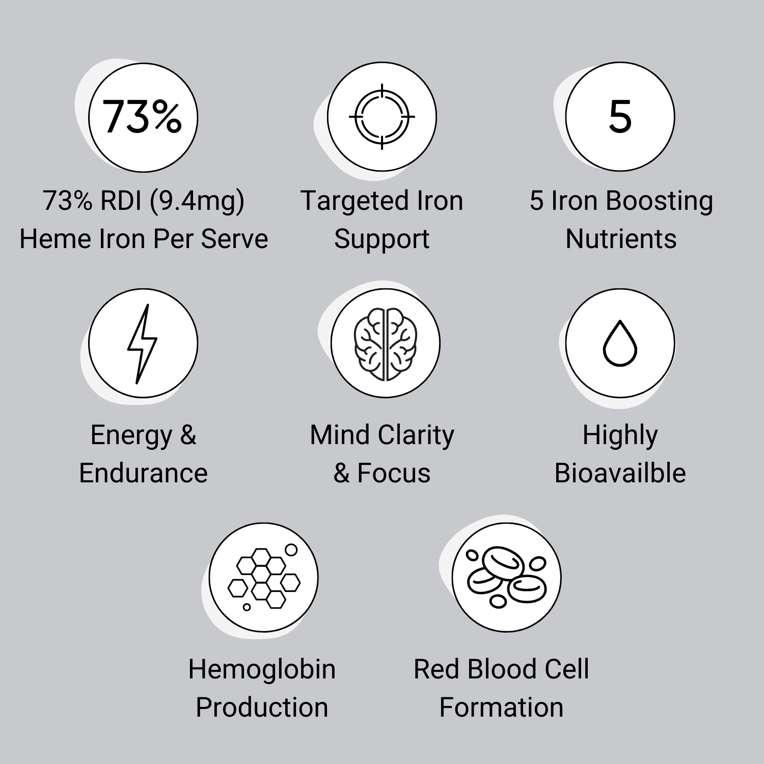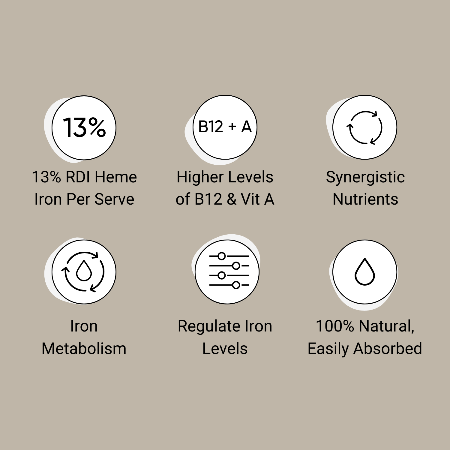 They contain 13% RDI of bioavailable Heme Iron per serve plus all the key synergistic vitamins & minerals which increase iron uptake in the body.
