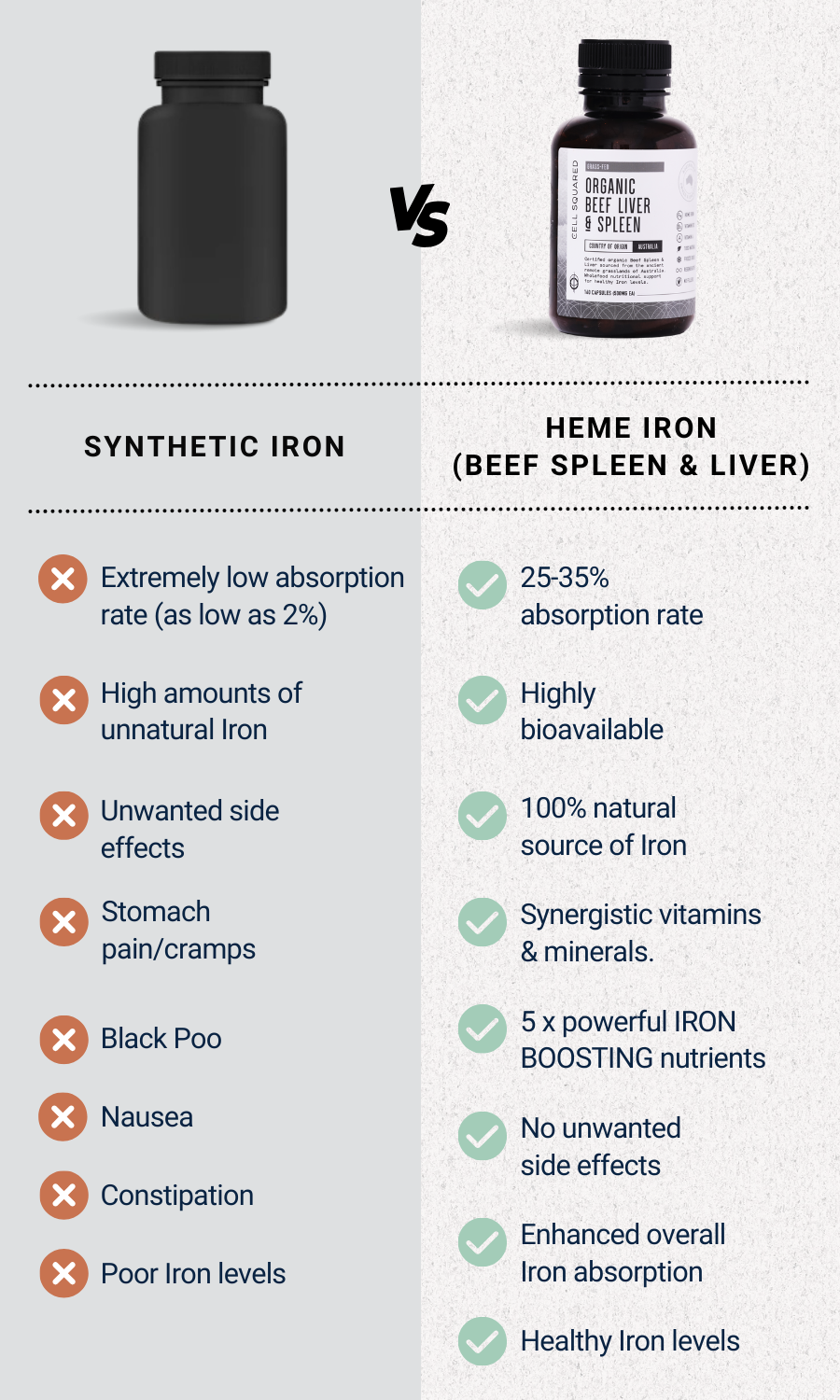 Synthetic forms of Iron have been found to cause side effects such as nausea, indigestion, vomiting, constipation, & even long-term gut health issues. This is why many are now turning to natural beef organ supplements.