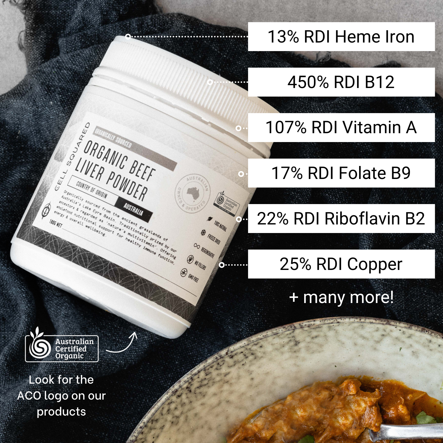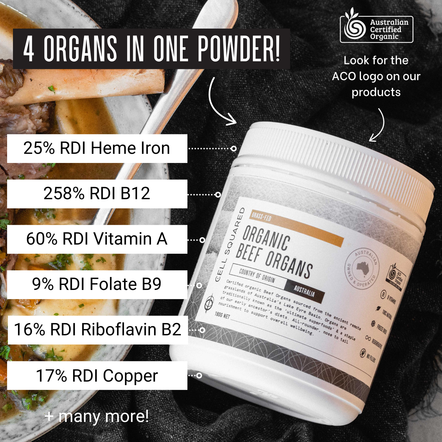 As a part of our continuous testing, verification and improvements, we recently reformulated our Australian Certified Organic Beef Organs Powder to have more easily absorbed Heme Iron per serve. Now providing 25% RDI of Iron per serve, plus five powerful iron boosting nutrients - Vitamin A, B12, Folate B9, Copper & Riboflavin B2 which all work synergistically to increase Iron uptake and usability.