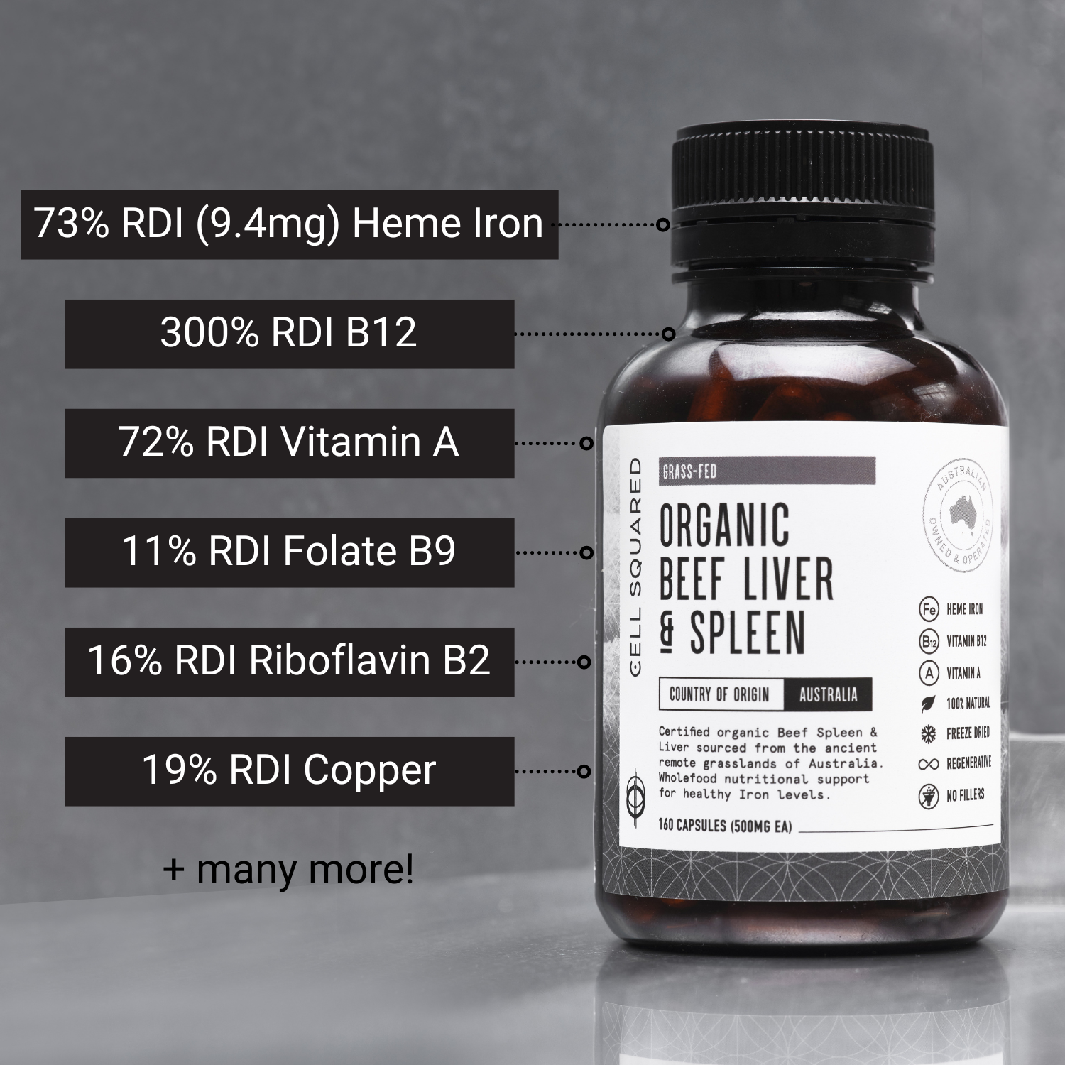 Can be used on their own or stacked - Our Organic Beef Liver & Spleen Capsules (AKA ‘The Ultimate Natural Organic Iron Supplement’) are a convenient way to keep your Iron levels replenished & regulated.