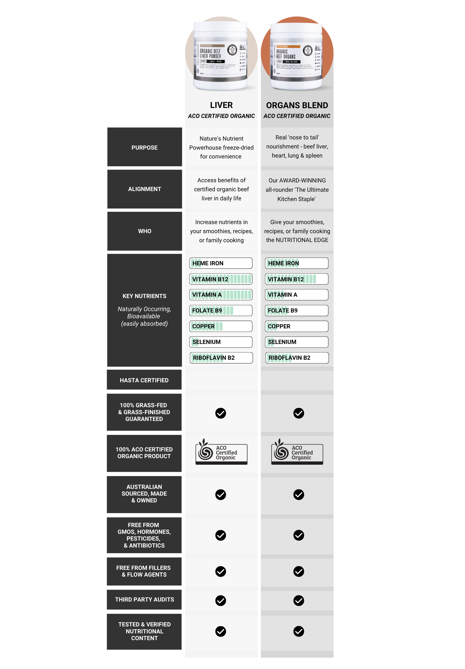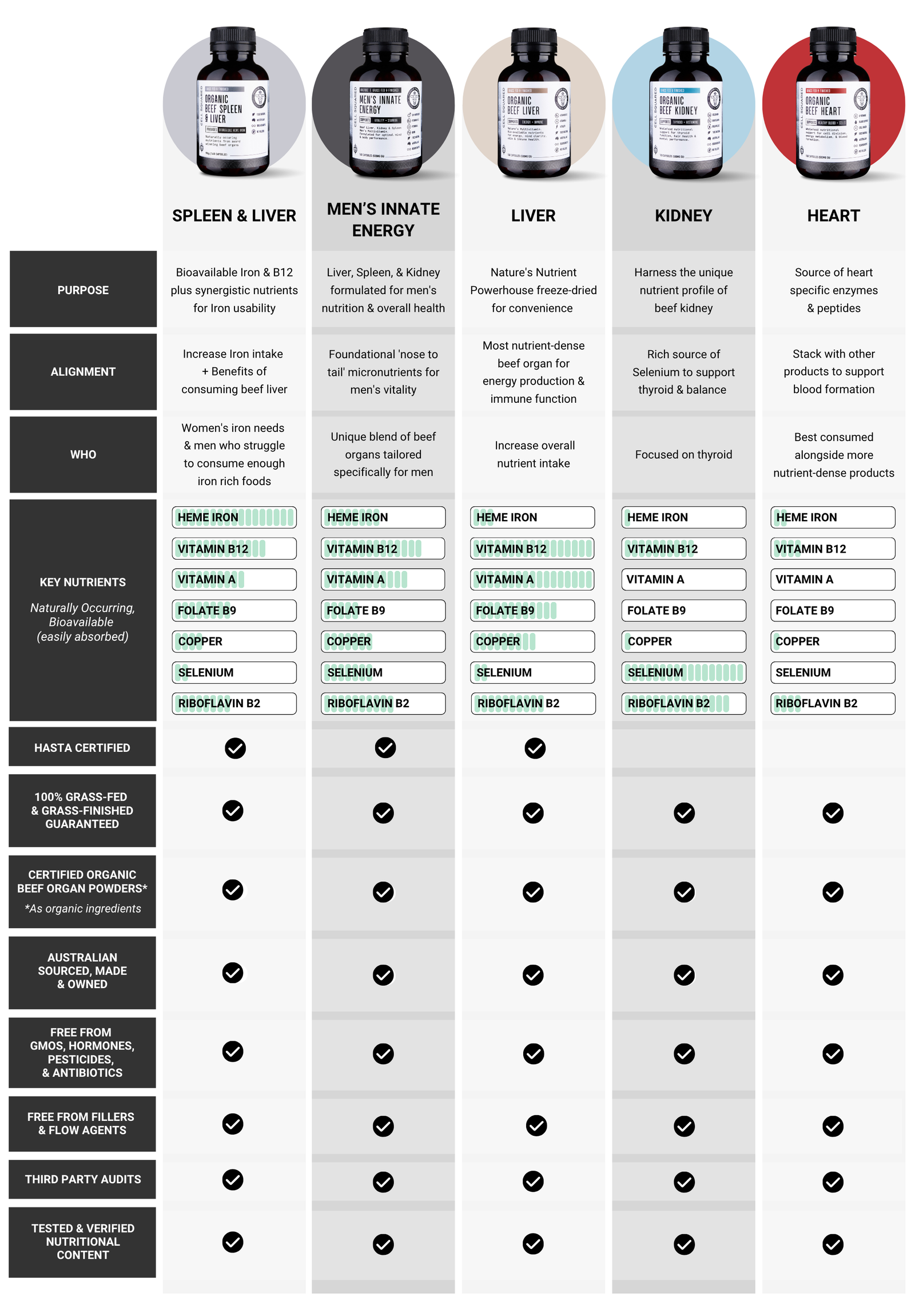 Using beef organs to increase IRON intake?...the ULTIMATE blend is our Beef Spleen & Liver Capsules or choose our Beef Organs Powder to add it into meals.