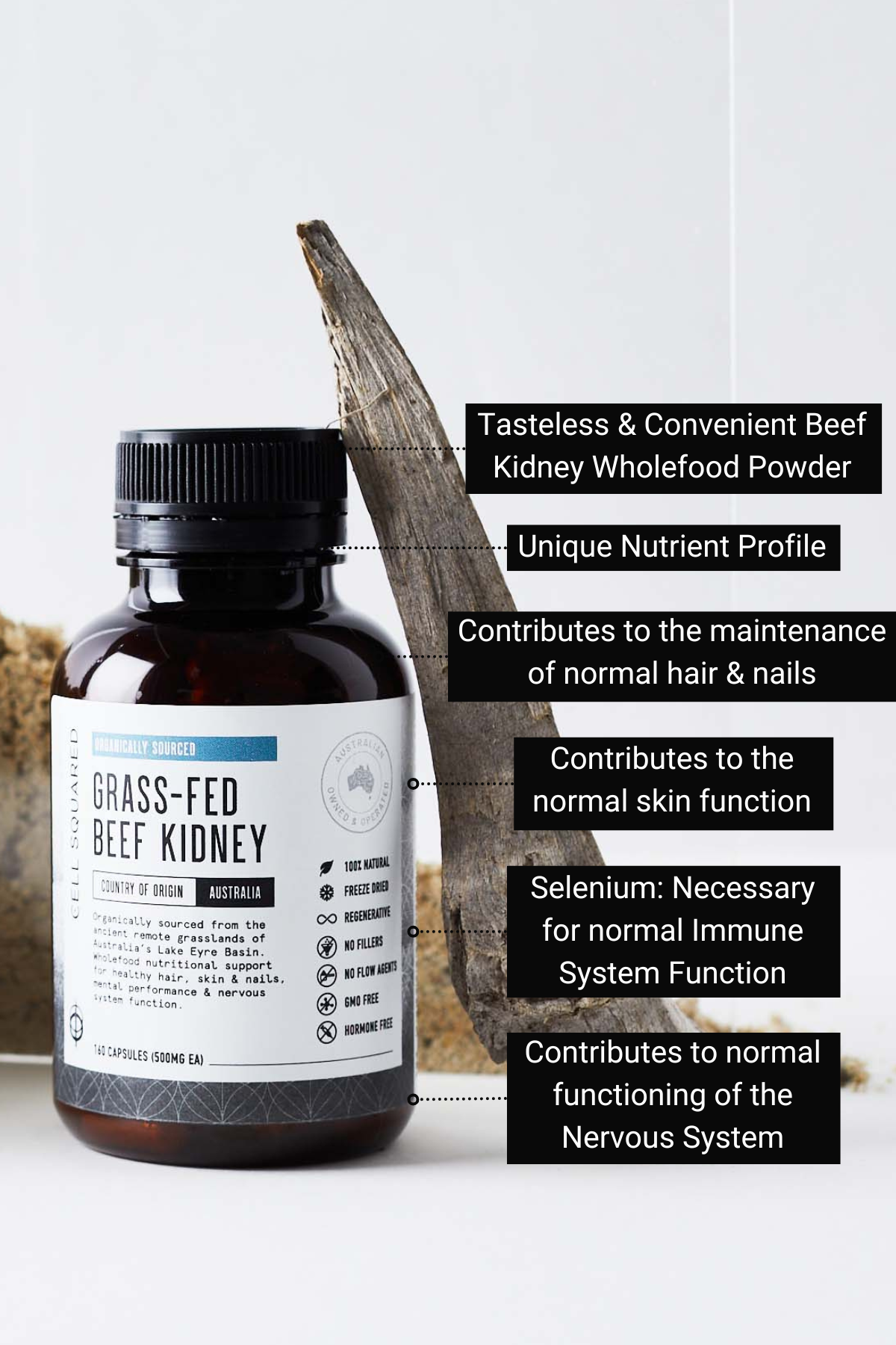 Freeze-dried beef kidney wholefood capsules with the MOST METICULOUSLY TESTED & VERIFIED nutritional profile on the market.
