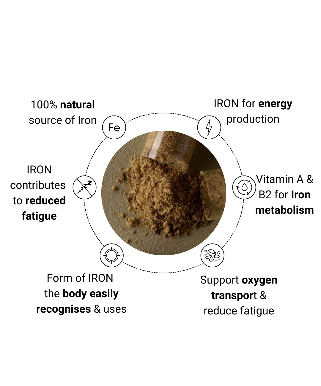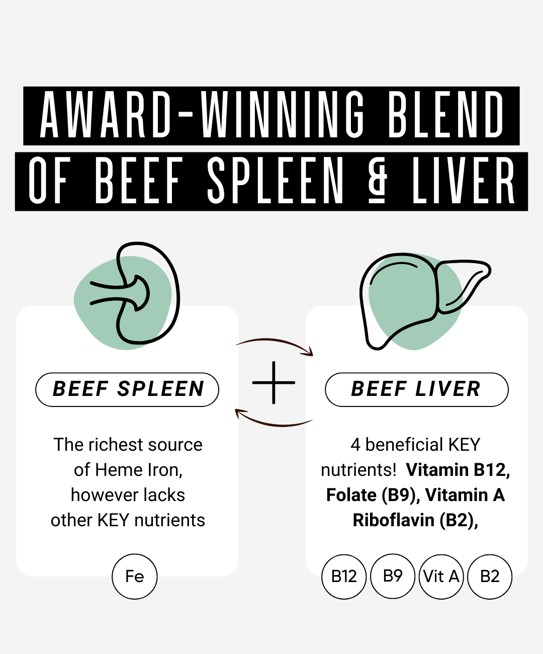 Using our nutritional test data, we’ve consciously formulated our AWARD WINNING unique blend of organic beef spleen & liver to deliver 78% RDI Heme Iron (9.4mg) alongside 4 other KEY nutrients.