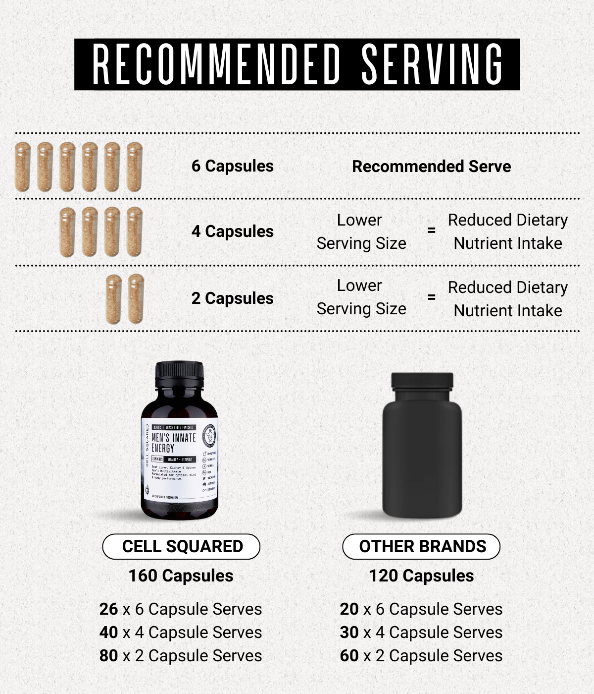 1 Serve (6 capsules) = Up to 18g raw beef organs or up to 34g cooked beef organs.