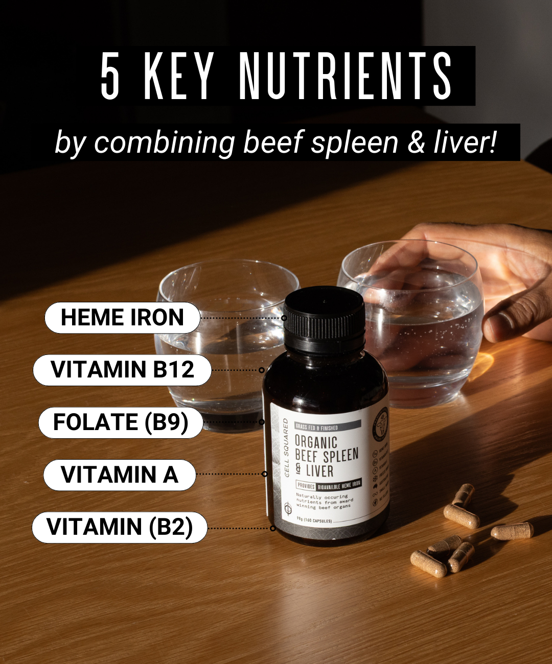 Using our nutritional test data, we’ve consciously formulated our AWARD WINNING unique blend of organic beef spleen & liver to deliver 78% RDI Heme Iron (9.4mg) alongside 4 other KEY nutrients.